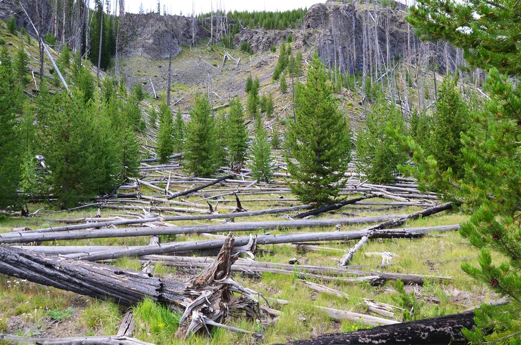 Hiking away and into the open meadow between our waypoints, the effects of the Yellowstone fires are really seen and felt here. The new growth pines are closing in on the old pine heights. In about 10 years, it’ll be really close to recovery … which makes me want to come back. 🙂