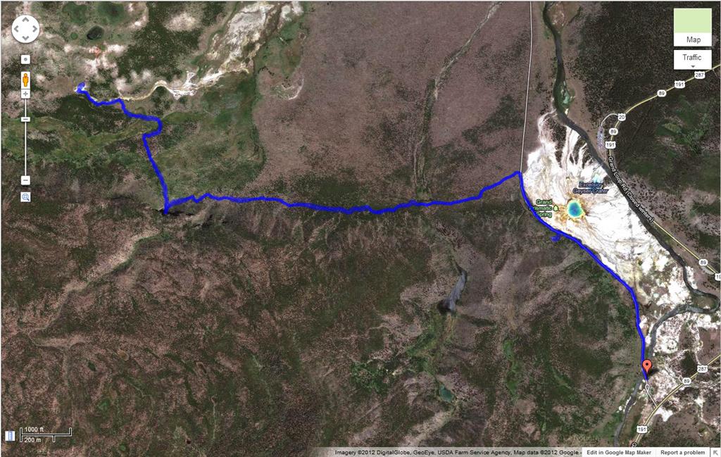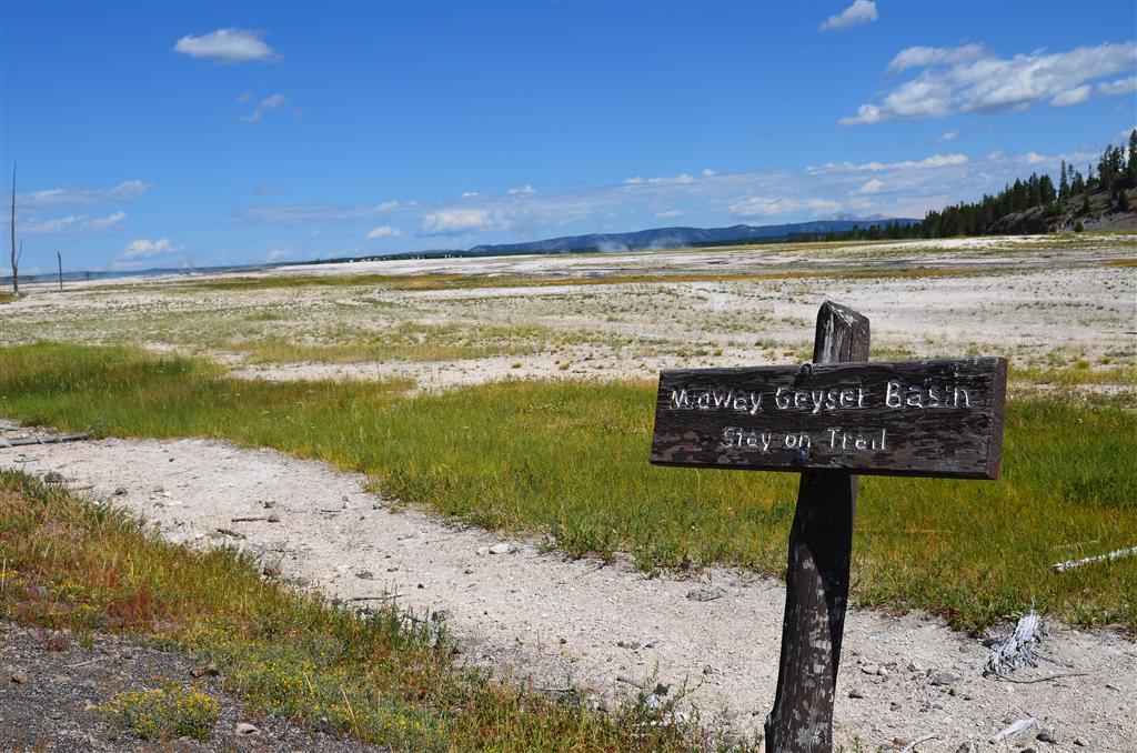 The trail walked alongside the River, directly across from the Midway Geyser Basin – home of some of the most impressive springs and pools in all of Yellowstone (which we had seen from ground-level just a couple of days before). A sign warned us to stay on the trail, because the actual surface of the Geyser Basin has areas that are unpredictably fragile and thin, resulting in some injuries to wayward travelers in the past.