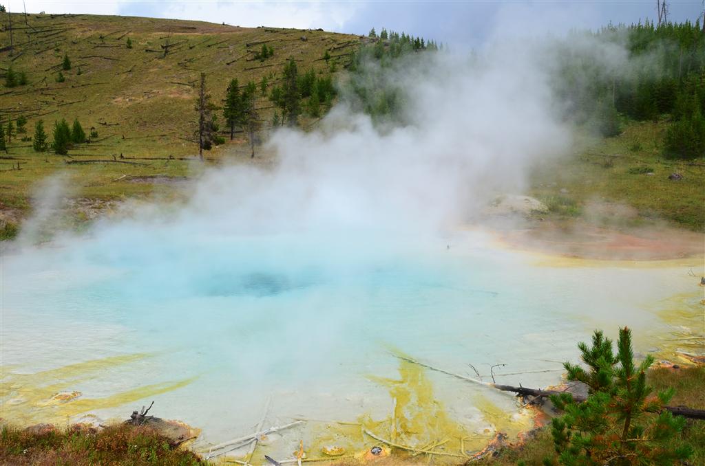 Walking along side Midway Geyser Basin and remembering what we had just seen recently, we wondered if any of the hills on our left would give a better vantage point. Just as we were discussing this, a pair of fellow hikers emerged from the trees and told us about an informal trail that would take us exactly what where we wanted to go up the hill.