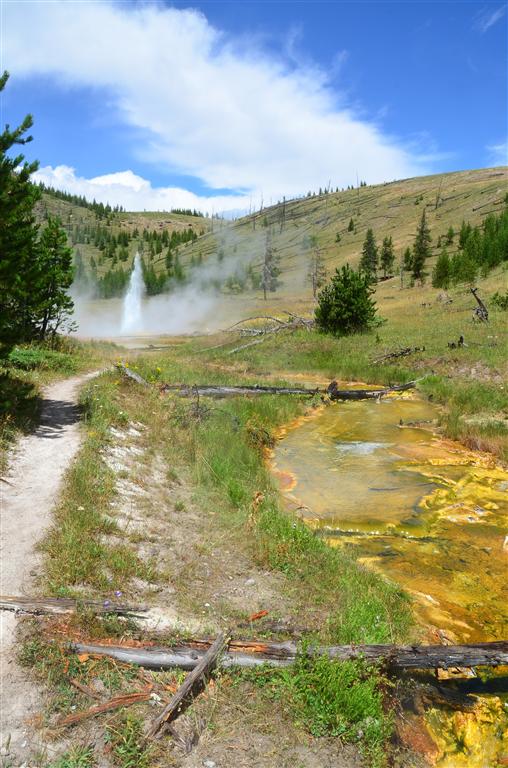 Heading away from Imperial Falls, we follow the stream that flows downhill from this small plateau. It’s VERY distinctive in its sulfuric coloring – quite beautiful to the eyes, but not the nose. Ha! Spray Geyser is easily visible from this path as well.