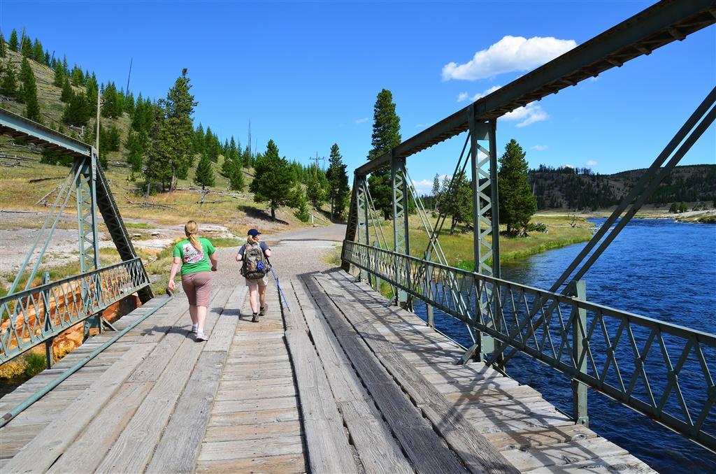 Located between two colorful hot springs of its own, the parking for our trail today only has a few vehicles as we arrive. Parking and heading across the bridge on Firehole River, Kathy, Mel, and I head out on our day’s adventure!