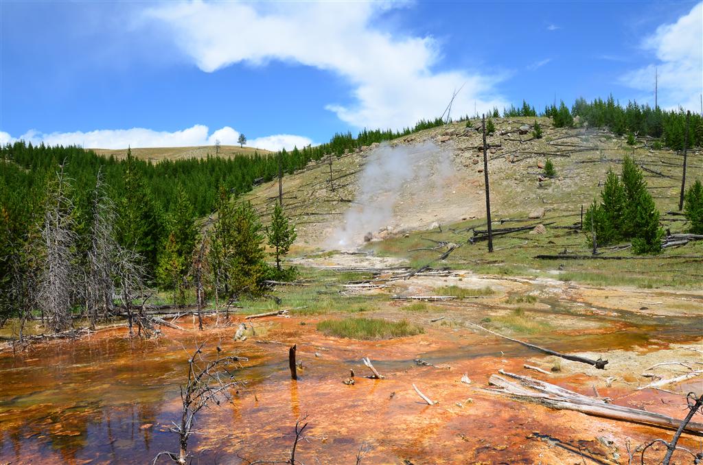 Climbing down the hill and leaving the wonders of Grand Prismatic behind, we start the longest part of our hike. The nice part is that we weave between open meadows and covered canopies, so we’re never out in the open sun for too long. Even though the temperatures aren’t horribly hot, walking out in the open sun is always warm, so the shade every so often is greatly appreciated. The impacts of the Great Yellowstone Fire are really seen here, with bare burnt Lodgepole Pine center trunks visible everywhere. The new growth pines are trying to recover and making a great effort, but they have some time to go still.