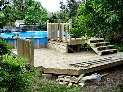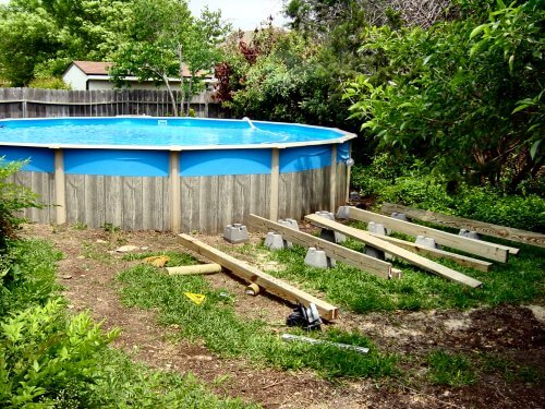 We bought a 24′ above-ground pool for the backyard recently… knowing that we’d need to put in some sort of deck or access to get in and out! The pool is really big and takes up most of the back yard, so the deck would have to be placed to the side.