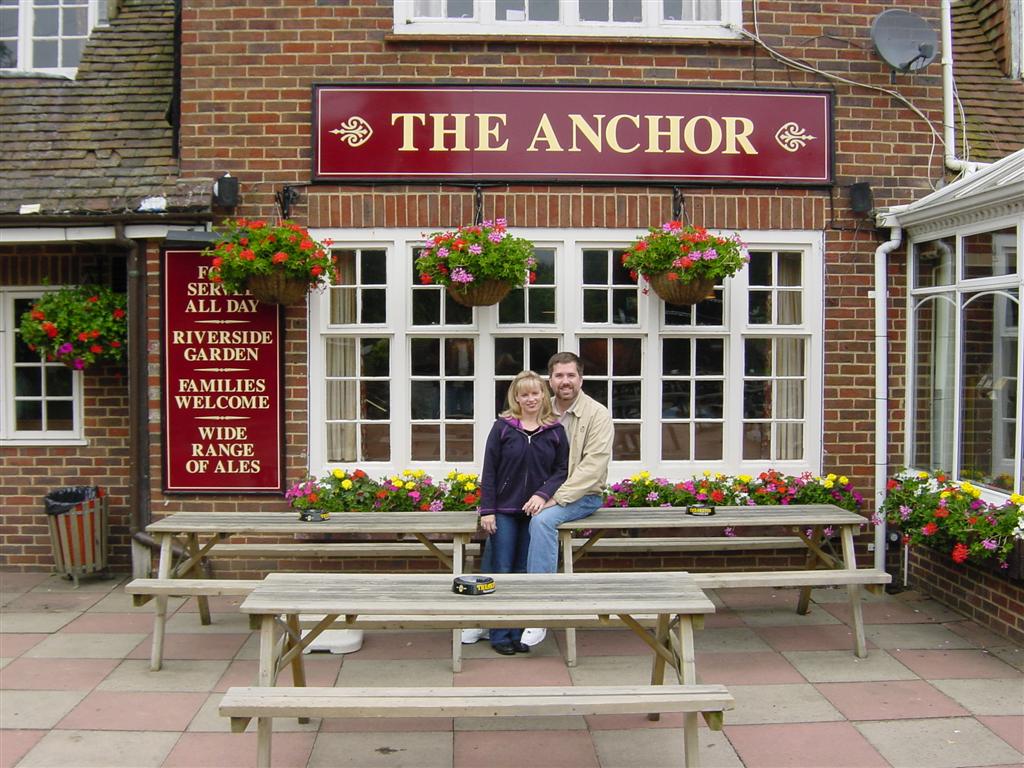 Roast beef lunch at the Anchor PubBefore noon, we pack up and go to get Jenny’s parents, visiting before they continue their holiday to the British southern coast. Jenny rides with them, and Kathy sits up front in the Rover 75, so she can enjoy the ride and the cool GPS map! 🙂 We all head off to a country pub named “The Anchor”. It is alongside a working canal, complete with fully functional locks.