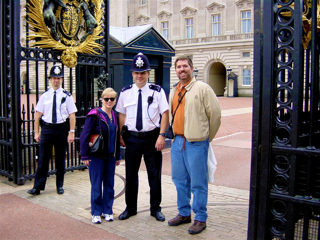 A nice walk past St. James’ park leads to Buckingham Palace. It’s very impressive!! We get a picture of us with a “Bobby” at one of the entrance gates!