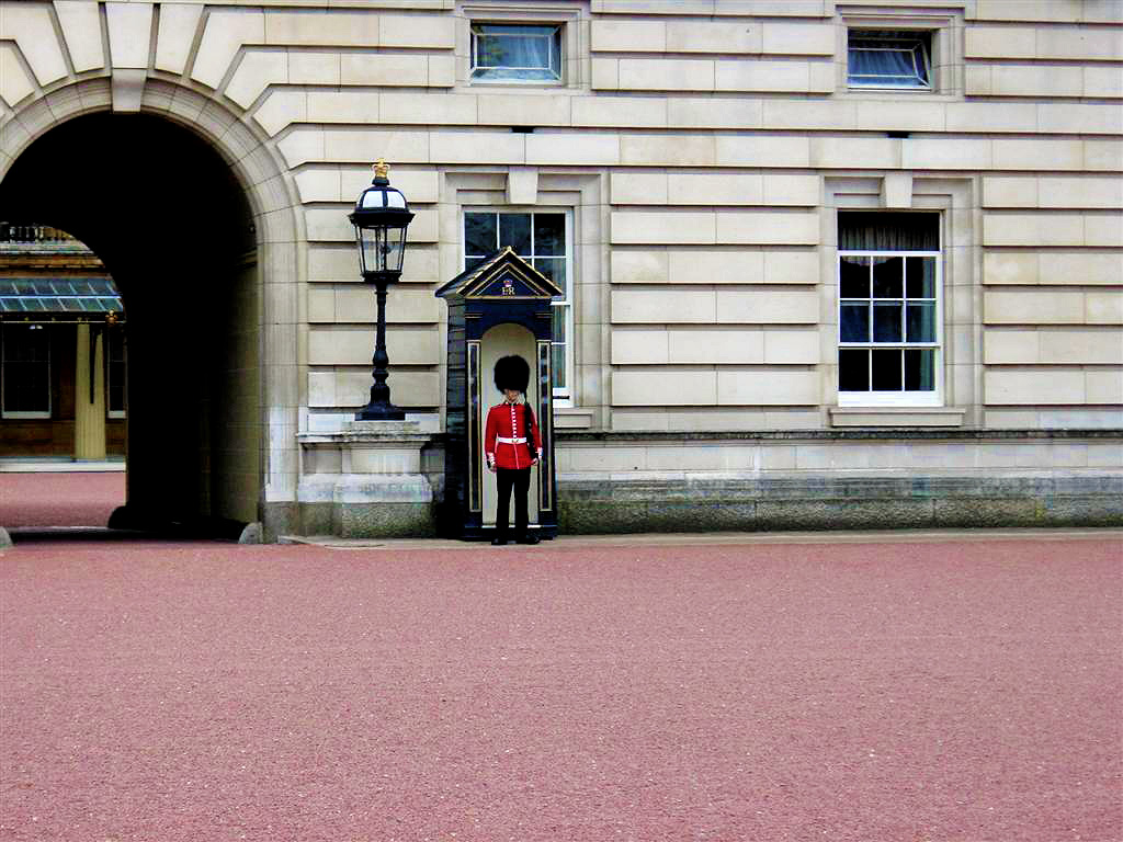 The Queen isn’t at home, so the guards are stationary. They still stomp their feet and change their guns to the other arm every few minutes to keep from cramping up!