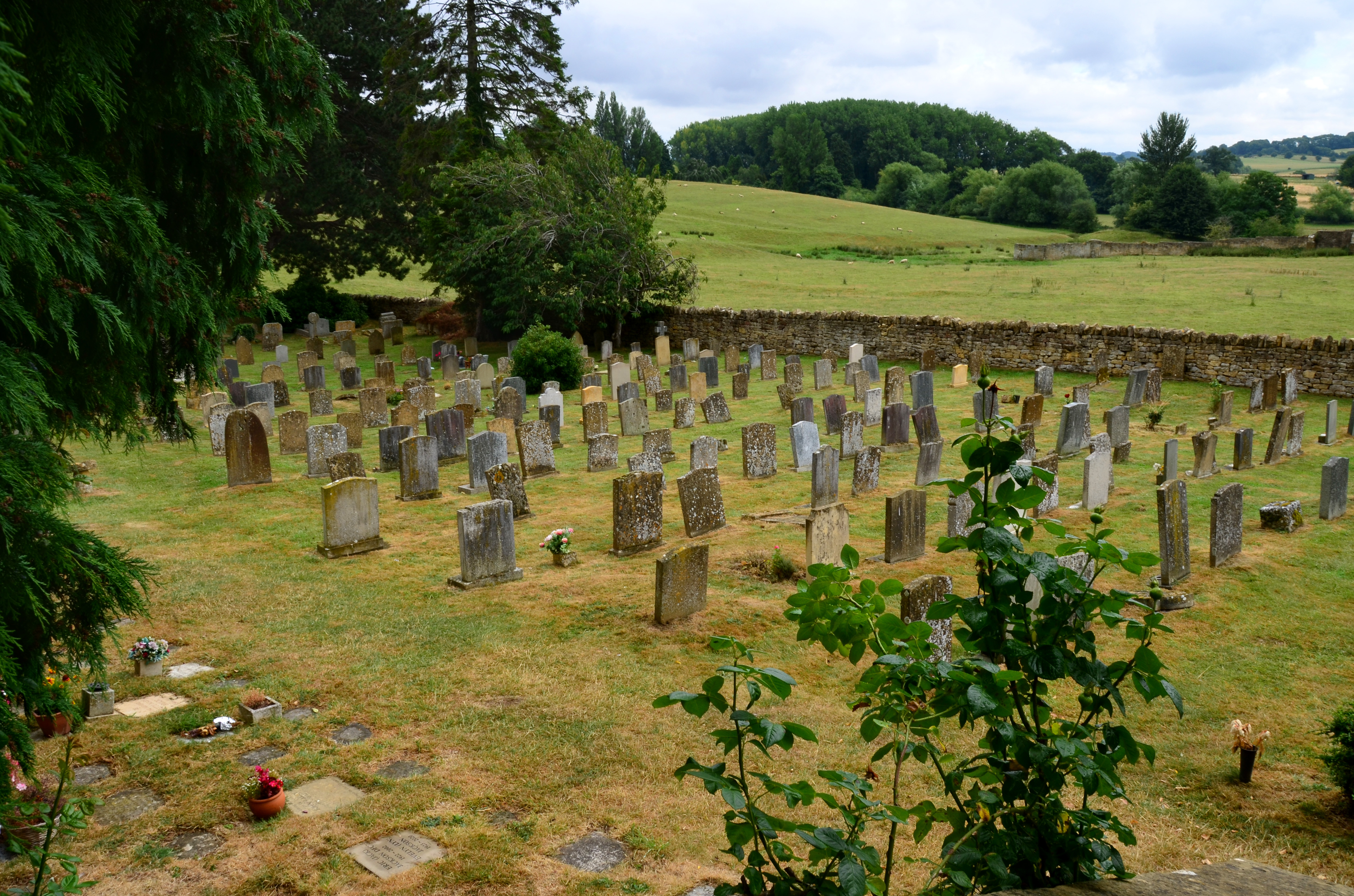 HOWEVER – walking towards the back, I’m almost overwhelmed with how massive and well-manicured the cemetery is.  Walking past ancient stones intermixed with modern, I get to a huge cemetery site in a segment set below the main churchyard.  In the distance, I see the fields from where I was taking photos earlier … and I am excited to see that the East Banqueting House is very visible from places in this cemetery section!