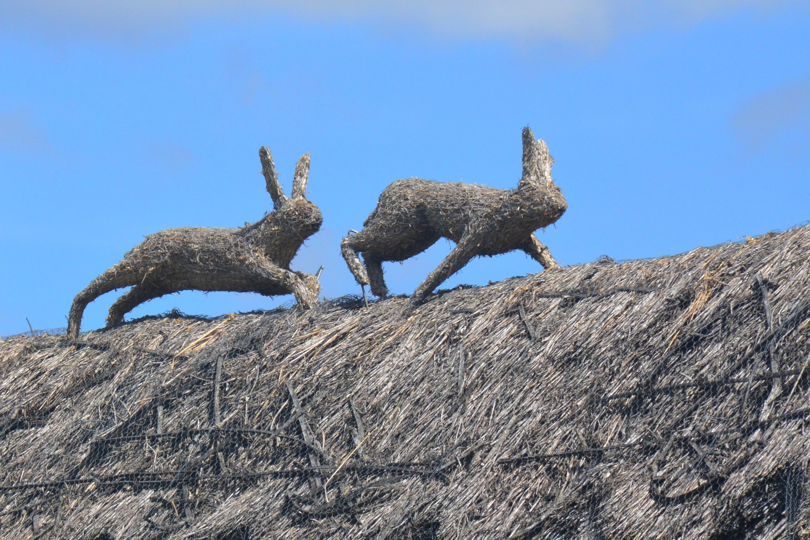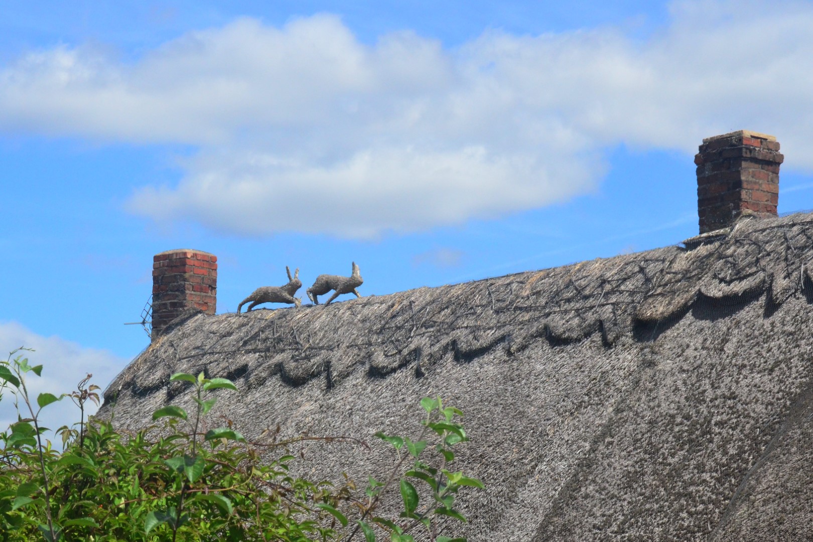 This time, walking up towards the small lane that leads to the main church gate, I noticed something on the roofline of one of the thatched roof houses. Stopping and looking … are those … rabbits? Zooming in with the camera shows yes, indeed! Those are thatch hares!