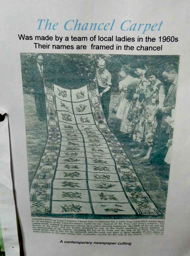 Besides the very impressive stained glass above the altar itself (and it was), there was a needlepoint rug/runner that stretched the entire distance of the chancel up to the altar itself. On the bulletin board on the way out was a scanned copy of the newspaper article about the ladies who made this carpet in the 1960s.