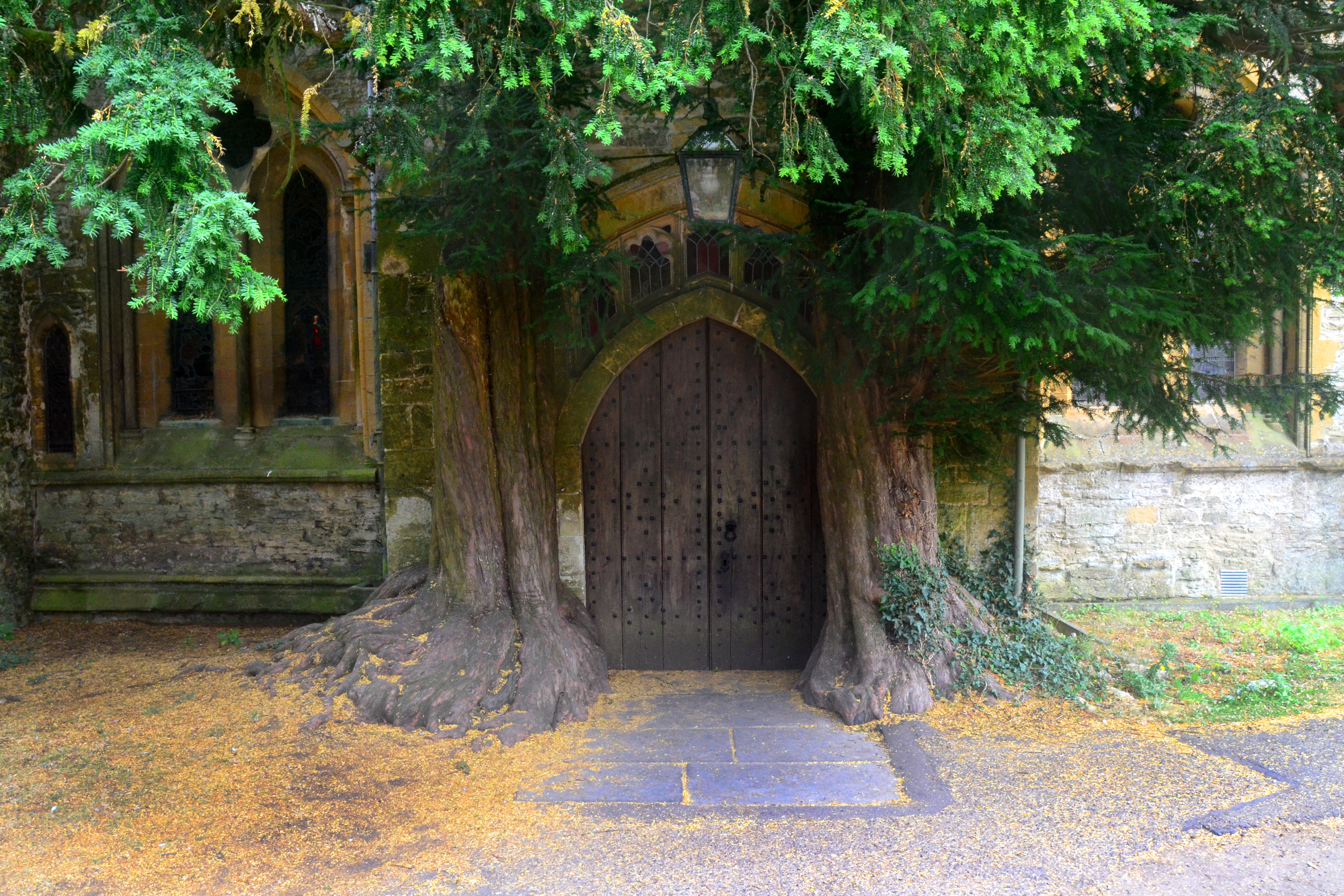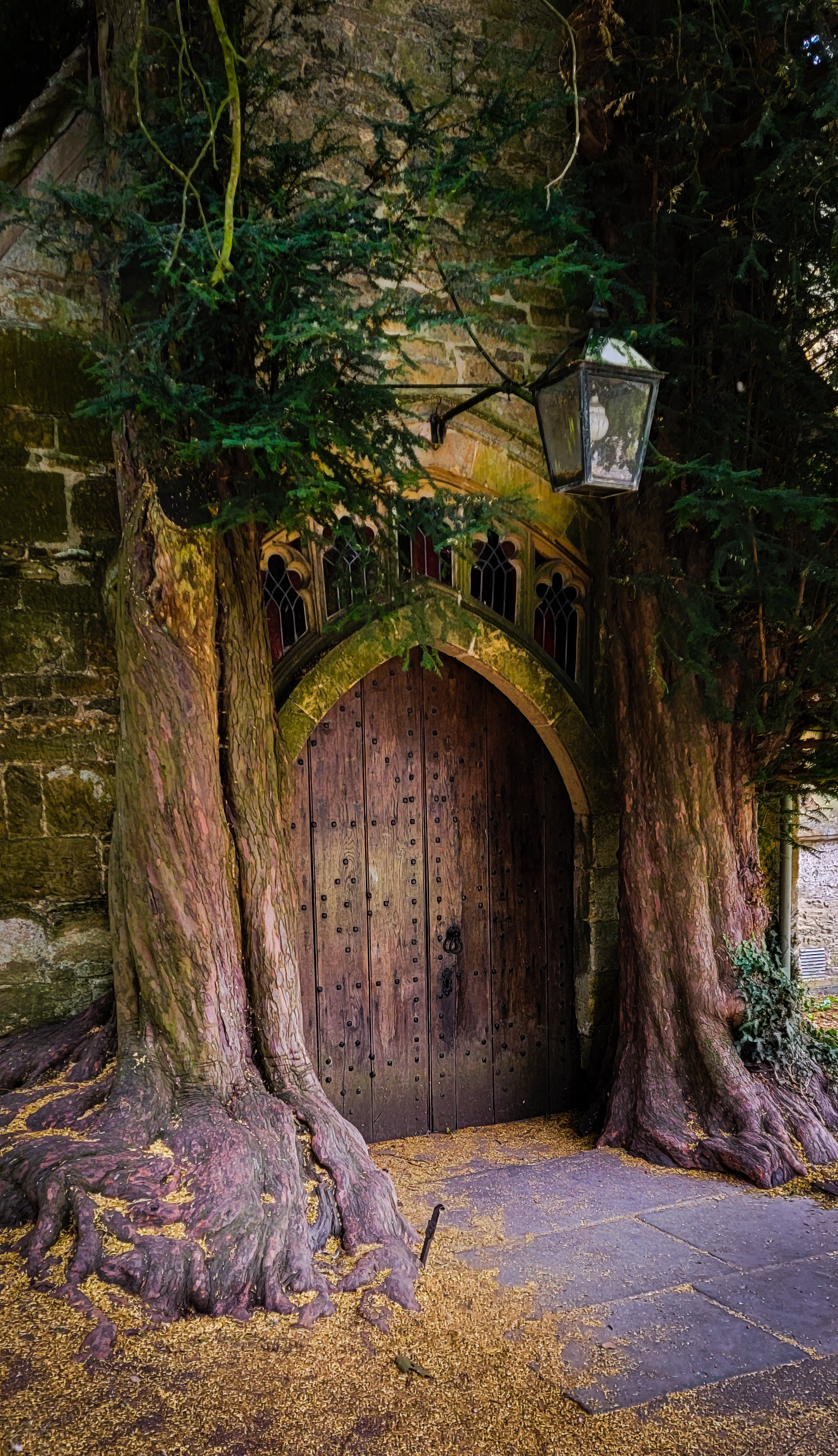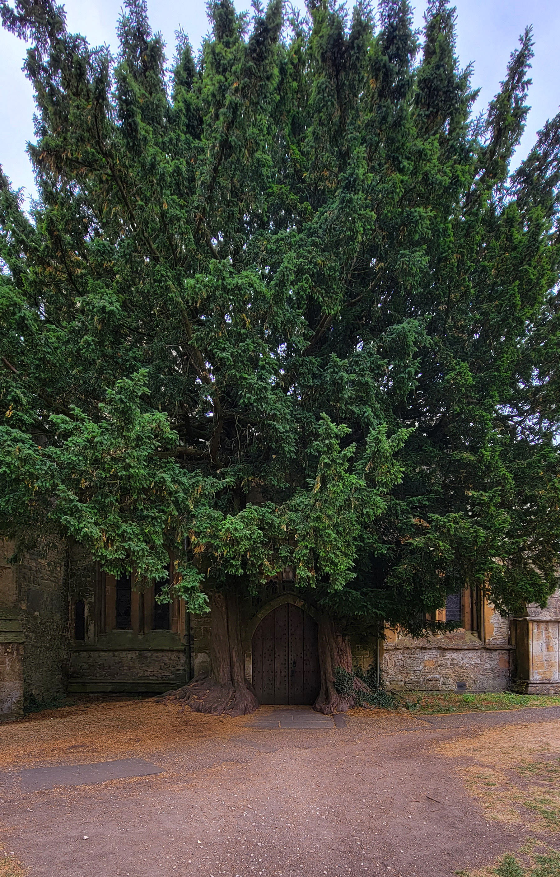 A side entrance is flanked by two massive Yew trees that have long since grown and become part of the church structure itself.