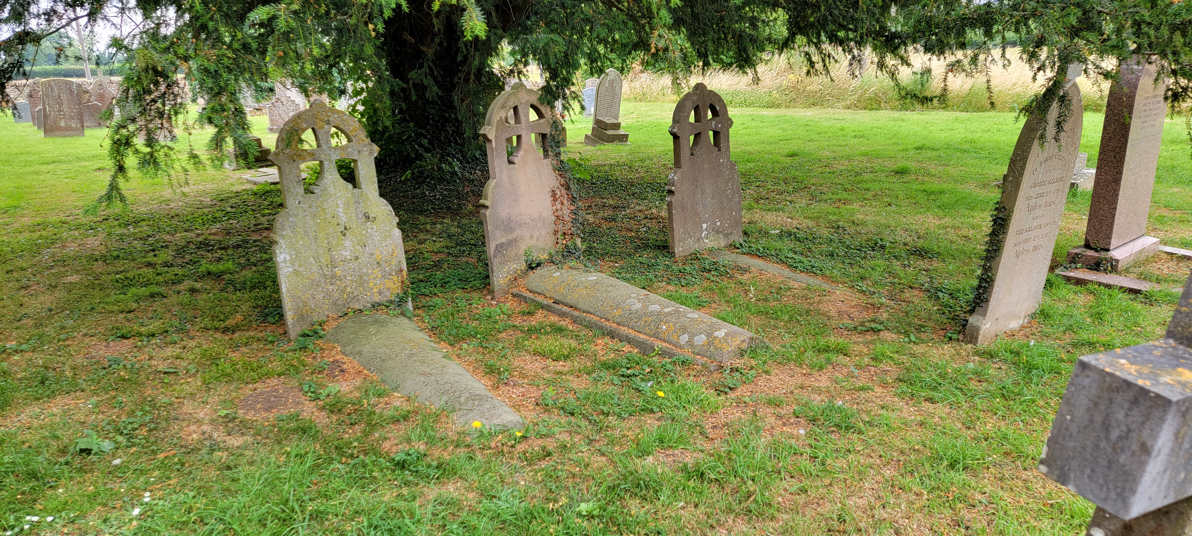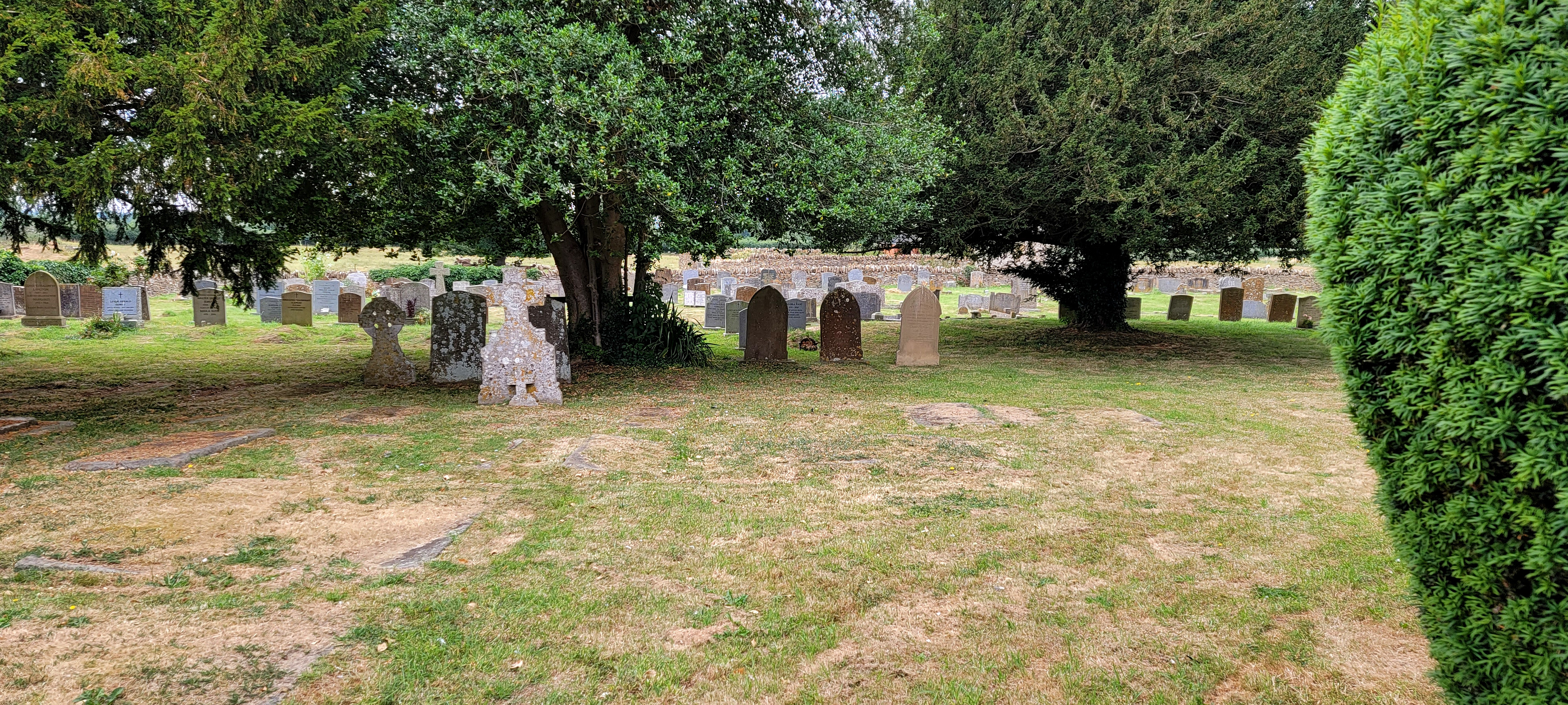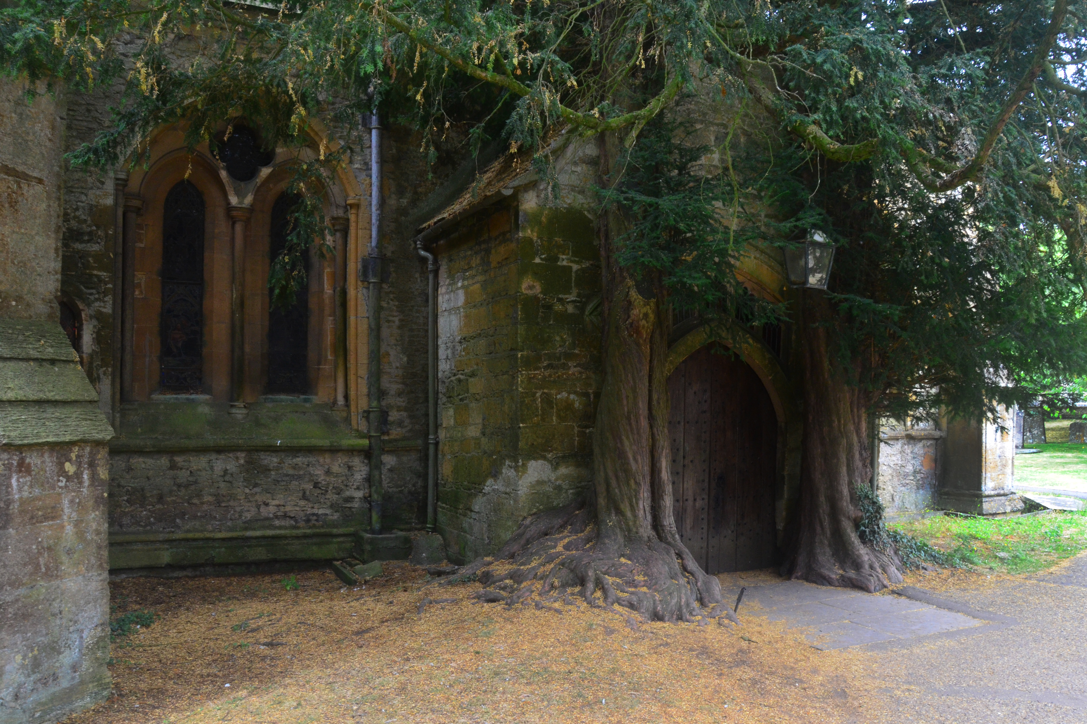 A side entrance is flanked by two massive Yew trees that have long since grown and become part of the church structure itself.