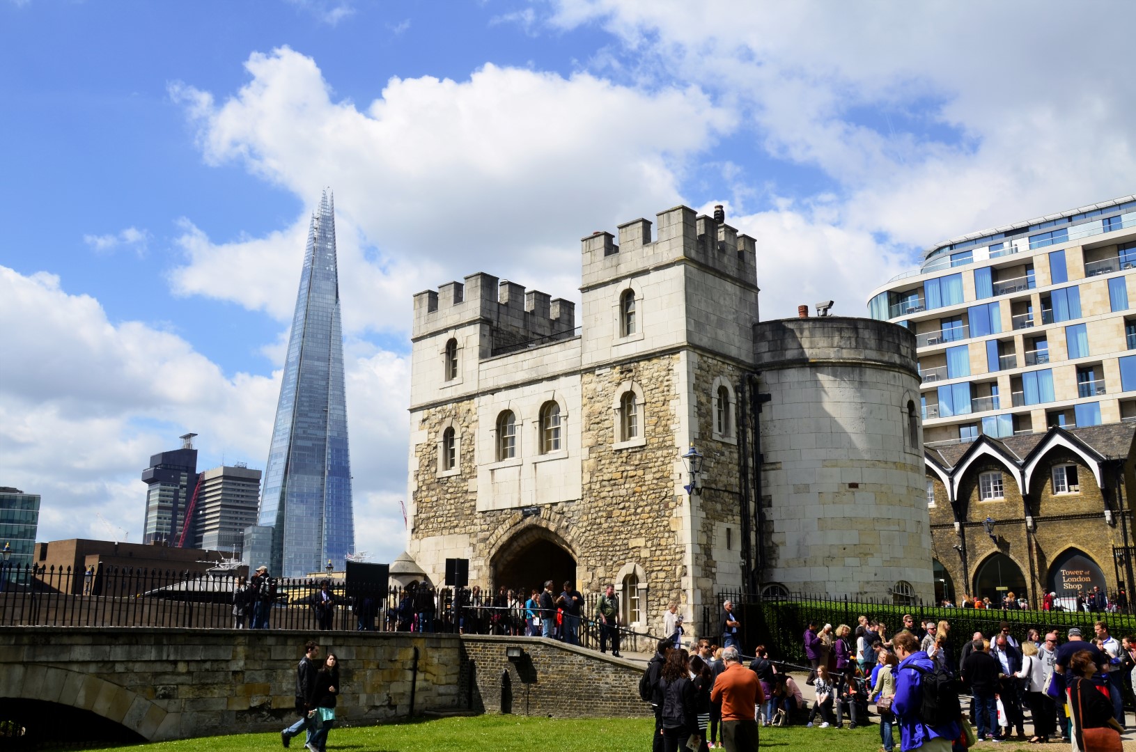 As we waited in the (thankfully now dry and beautifully grassy) moat, we remarked on how interesting, if not disconcerting, it was to see such old historical structures (like The Tower) with such modern glass buildings literally next door.