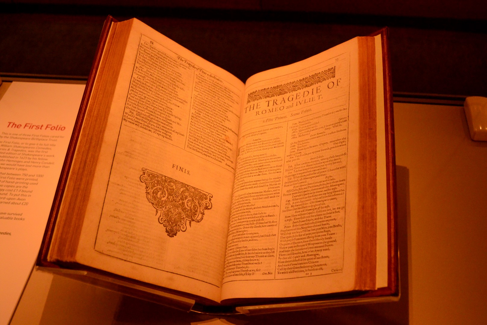 After thanking our very friendly hosts, we take a walk through the museum, where one of the three First Folios that the Birthplace has in their possession is displayed in a special environmentally-controlled glass case.