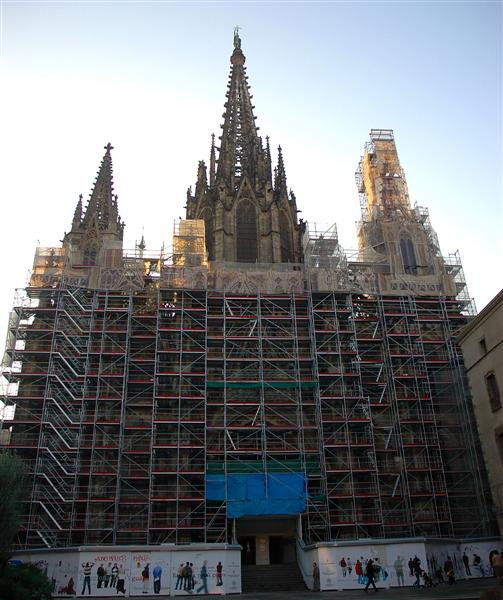 Our first stop is the huge Gothic Cathedral of the Holy Cross and Saint Eulalia, aka the Barcelona Cathedral. Unfortunately, scaffolding wraps almost the entire front for remodeling work. Disappointing, but we are still able to go inside – and WHAT an interior this cathedral offers us!