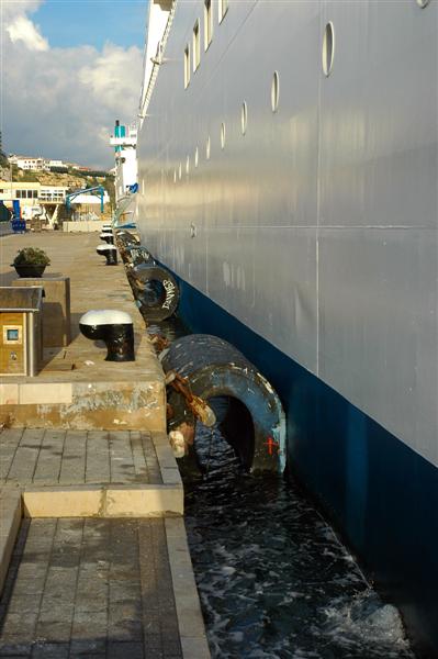 Northern tip of channelIt is, however, time to disembark – and we gently glide back up the inlet, guided by our pilot boat.  Reaching the exit, a small lighthouse is ready to help guide ships to safely avoid hazards.  And then, we’re out in the open Mediterranean again.
