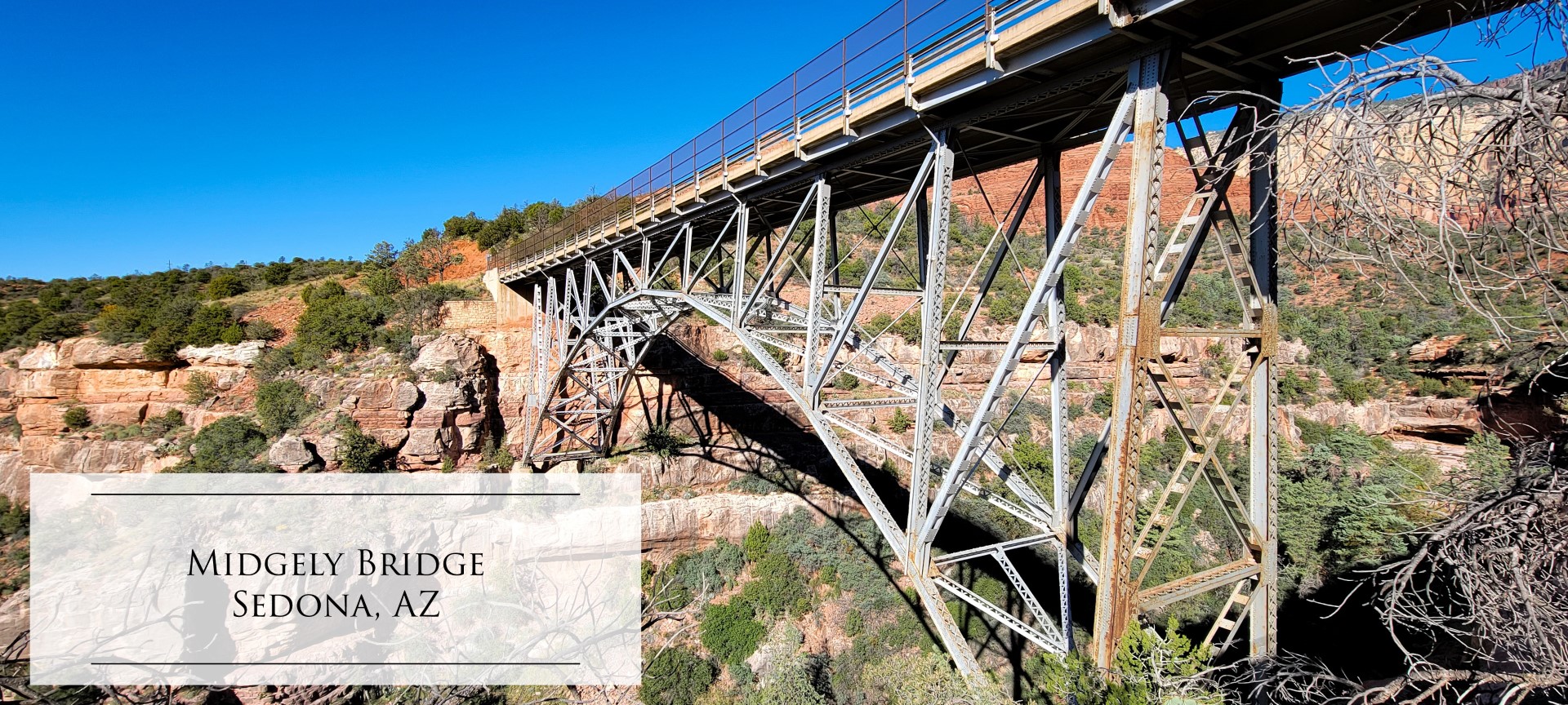 One of the eastern-most (from our perspective) formations was almost unremarkable until the light and shadows created what looked obviously like a large stone-carved throne jutting out from the rocks. Several stone pillars to the left gave the appearance of challengers for the throne just waiting for their opportunity to arise with the sun. Some more coffee with a welcomed breakfast and we’re ready to start our day. Just north of Sedona, at the entrance to Oak Creek Canyon (tomorrow’s target) is the impressive Midgley Bridge.