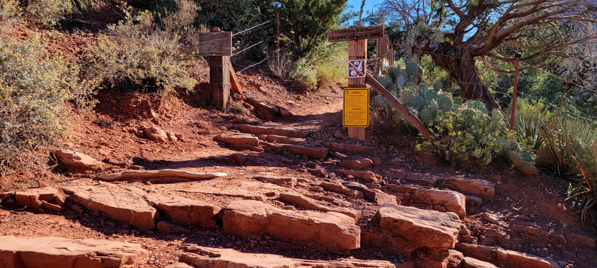 Built in 1939, this arched bridge spans over the confluence of Oak Creek and Wilson Canyon on highway 89. There’s a small parking lot with only a few cars of hikers who had started earlier in the day to head off into one of the two canyons here. Making our way down the steep and unsteady stone steps, Kathy and I let Paul enjoy the views on a natural stone bench while we head down the trail for a short bit.