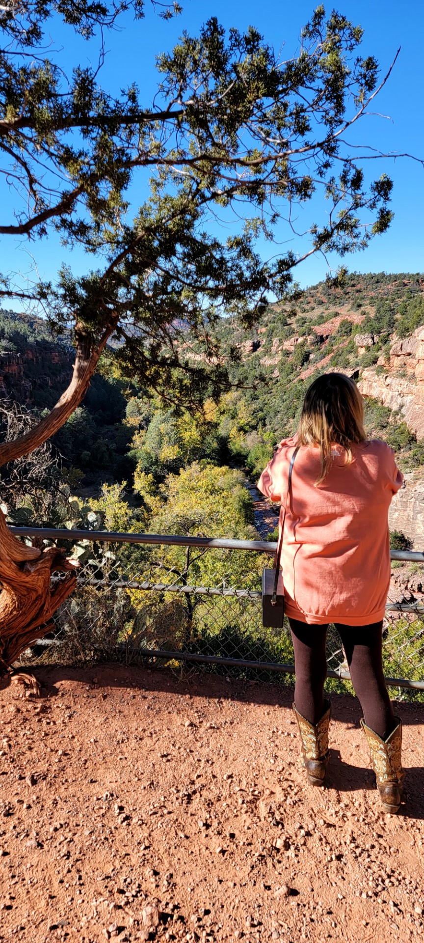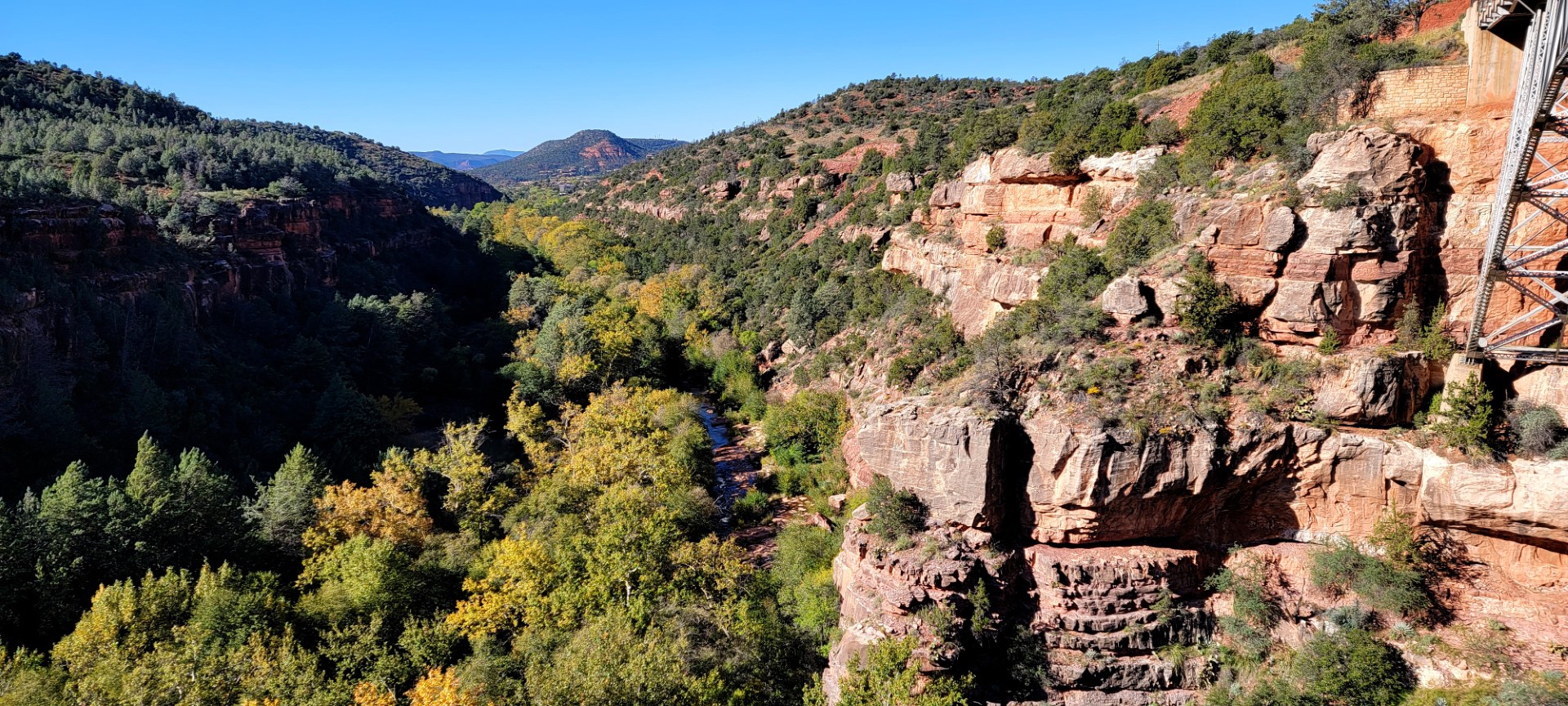 Crossing under the bridge itself, we get to a great vista overlook. With an occasional car on the bridge behind us, the bubbling Oak Creek deep below us provides a great compliment to the breeze through the surrounding trees. We haven’t been here 24 hours yet and have seen so very little, but we’re already hooked on Sedona and will return again.