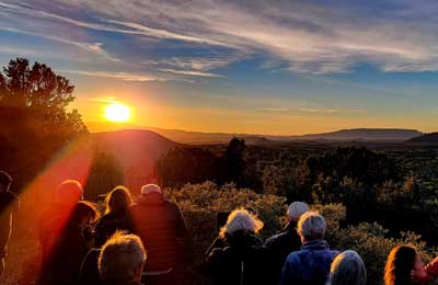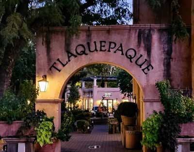 A fun photo of Kathy and Paul peeking out from a tree later, and we’re heading back to the house for sunset and dinner down at the Tlaquepaque cultural marketplace!