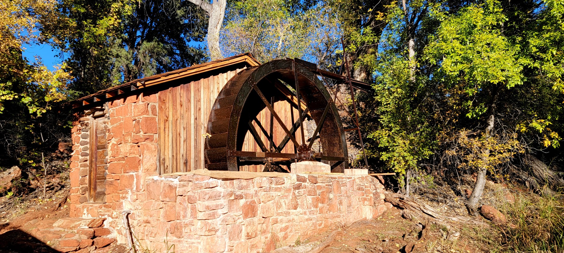 A few steps from the parking lot and we’re greeted with an almost planned-for-social-media setting of trees, fenceline, an old waterwheel and mill house… and the star of the show rising behind it all. Fortunately, that pre-trip planning let me know that there was still even more to come, just a short walk down to the lower section of the same Oak Creek we had visited that morning!